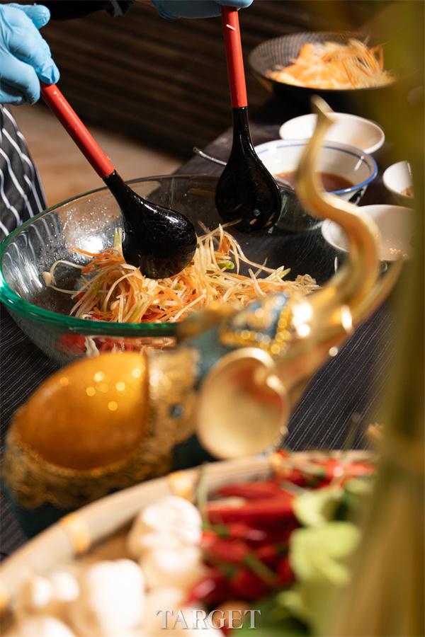 在领事馆主厨的魔法手中,经典泰式料理焕发全新生命力。开胃前奏以泰式鲜虾饼的Q弹与猪肉末炸面包的香脆开启味蕾之旅;泰式烤牛肉沙拉与青木瓜沙拉则以酸辣交错的层次唤醒感官。主厨更将冬阴功汤升级演绎——宾客可在海鲜池亲自挑选现捞海鲜,定制专属风味。