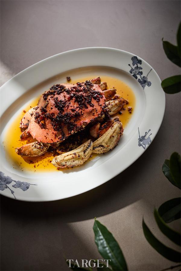 “尊重本味,守正创新” 是苏巍青师傅的烹饪初心,亦是此次菜单的创作灵魂。古法豆豉辣椒炒蟹一菜,便源自对古籍中 “炒蟹”、“盐豉” 技法的深度溯源 —— 甄选膏腴丰腴的当季活蟹,蟹身凝脂流黄,先以粤式古法淬炼基底,更突破性融入醇厚豆瓣酱点睛增鲜。豆豉的咸香、豆瓣酱的绵厚与蟹鲜缠绵交织,馥郁气息漫溢席间,每一口都是鲜醇回甘。