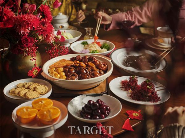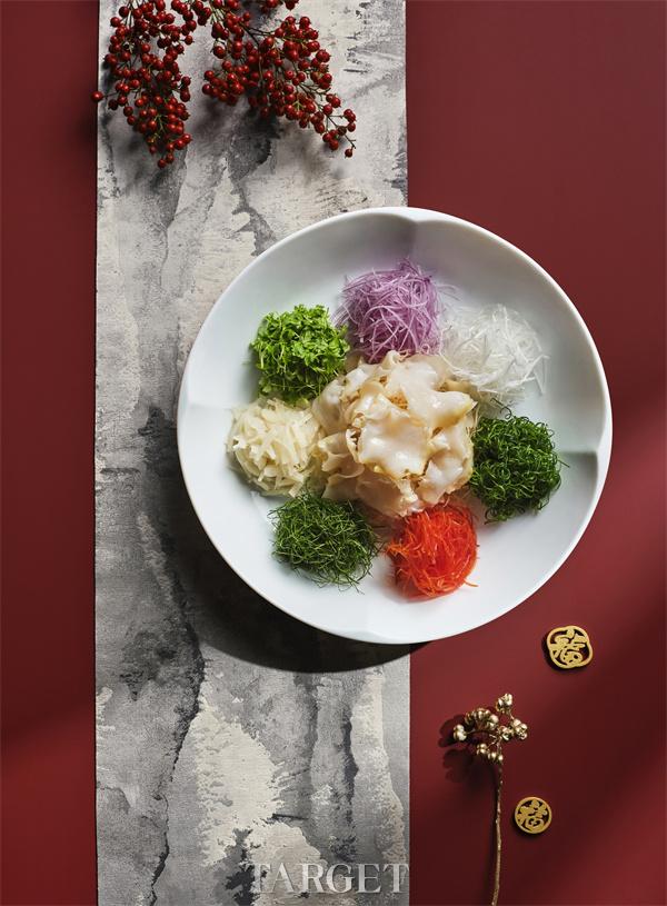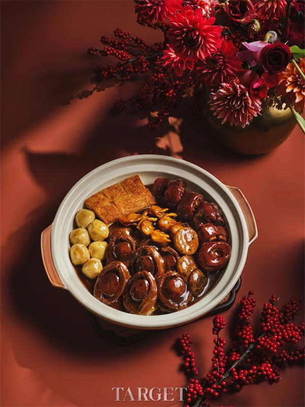 餐桌之上,甄选寓意吉祥的经典年菜与匠心食材。以寓意吉祥的獐子岛螺片风生水起作为开年第一道前菜。甄选海螺入馔,佐以多种爽脆配料,举箸高捞,齐声“捞起”,寓意新一年风调雨顺、事业生活节节高升。熟悉的仪式感,为团圆时刻开启喜庆序幕。潮汕卤水36个月老鹅头,经传统卤水慢火入味,肉质紧实弹嫩,咸鲜醇厚,是南方年节餐桌上不可或缺的重头戏。层层叠叠的广东吉祥如意盆菜,汇聚鲍鱼、烧肉、生蚝、猪手、花菇、鱼丸、莲藕等食材,象征“盆满钵满”,也寄托着阖家共享、团圆相聚的美好期许。当红脆皮葵香鸡,精选只以谷物与葵花籽饲养的葵香鸡入馔,肉质细嫩多汁。经温度精准的处理工艺,使鸡皮金黄酥脆、内里柔嫩鲜香,色泽喜庆,寓意新春兴旺、家业当红。刨葱蒸东星斑则以“少即是多”的手法呈现本味。鱼肉细致鲜甜,搭配刨制葱丝轻覆其上,葱香更为浓郁而不夺味,热油激香之间,象征新一年红红火火、年年有余。