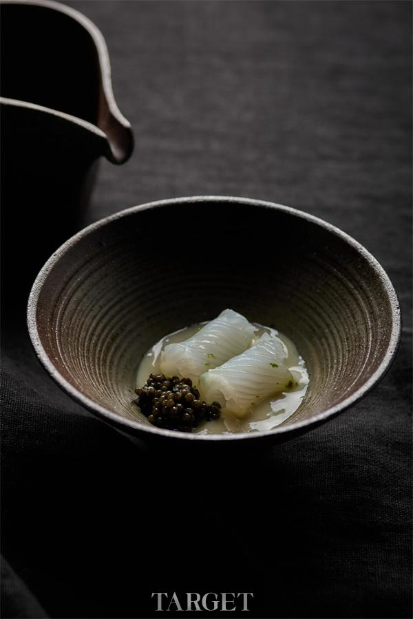 选用来自东海的障泥乌贼,其肉质黏糯鲜甜。搭配以橄榄仁与青提制成的西班牙白色冷汤 Ajo Blanco,在坚果香气之外带来清亮果味;再以鱼子酱点缀,使整道菜在鲜甜、清新与海洋气息之间形成平衡。