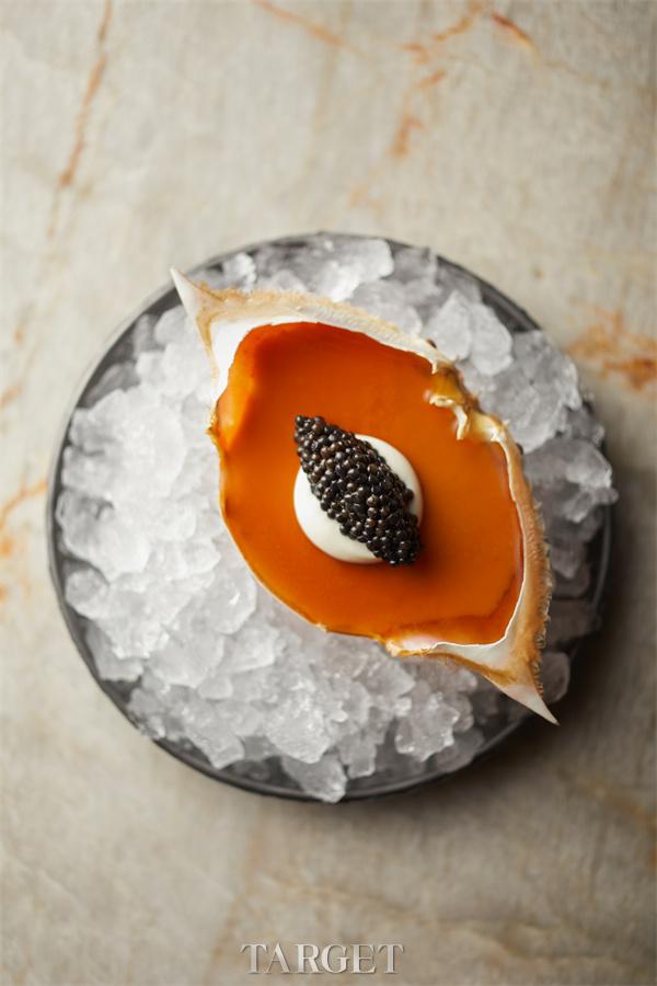 选用黄海鸭绿江口捕捞的鲜活梭子蟹,借鉴中国南方沿海“生腌”的处理灵感,以酱油腌渍两夜,使蟹黄呈现近似溏心蛋黄般的绵密质感,蟹肉则更加紧实鲜甜。搭配鱼子酱与花菜慕斯,在呼应法式经典组合的同时,也呈现出对中国沿海风味的当代表达。