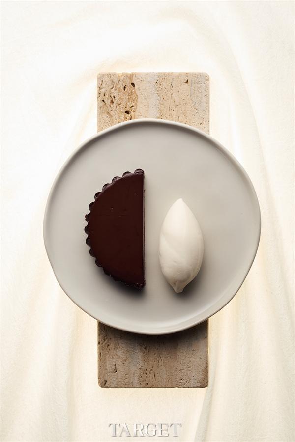 选用72% 黑巧克力制作,塔壳中注入焦糖坚果酱夹心,以平衡黑巧克力本身的微苦与微酸。搭配以本地沙丁鱼自制鱼露制成的鱼露冰淇淋,使咸、鲜、冰、甜等多重风味在口中交织,为整套用餐体验带来更具辨识度的收尾。