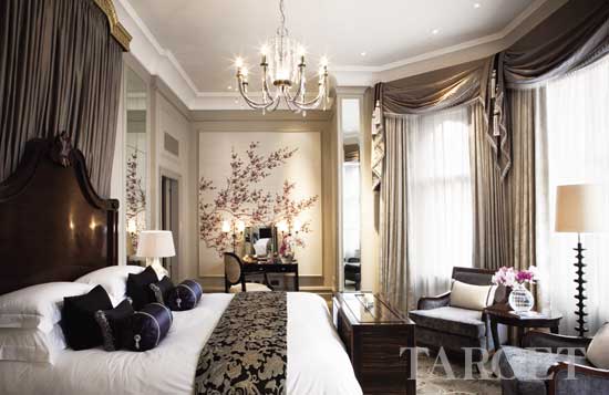 令人意想不到的是,客房,完全又是另外一种景象。丰富的色彩带着英伦古典主义的特色在巨大的落地窗前相处融洽。据说这些色彩都是来源于那些具有治疗功效的宝石,比如玉石、黄宝石、紫水晶和红宝石。搭配了灰色、赤红和淡白色,便创造出了一个“平静的绿洲”。不能忽视的是,墙上悬挂的现代艺术品与整个房间的基调契合到了找不出一丝反驳的空隙,而意大利式的石膏天花板和错综复杂的马赛克地板上下呼应,佩斯利螺旋花纹呢盖毯分明又为室内添加了几丝来自19世纪欧洲的气息。
