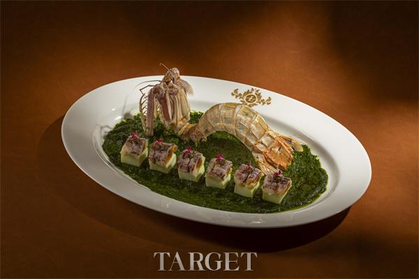 “藤椒溏心富贵虾柳” 严选膏腴饱满的富贵虾,佐以云贵川地区新鲜藤椒自制的藤椒酱。采用西式低温慢煮工艺,精准控温,使虾膏呈溏心状态,嫩滑鲜美。藤椒酱麻而不燥,轻辣提鲜,巧妙引出山海交汇之风韵。