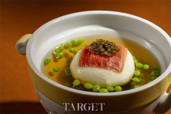 “诺邓火腿黄鱼鱼腐汤”突破传统,以云南诺邓淡盐火腿与福建生态大黄鱼为主料。诺邓火腿风味醇厚,咸香适中,可直接生食;黄鱼肉质细腻,取代传统鲮鱼制成鱼腐,口感如豆腐般滑嫩。汤底更见匠心,融入虾、蟹、文蛤、干瑶柱及老鸡一同炖制,汇聚海陆精华,鲜味层层升华,最终融山海之鲜于一盅,清雅悠长,韵味深长。