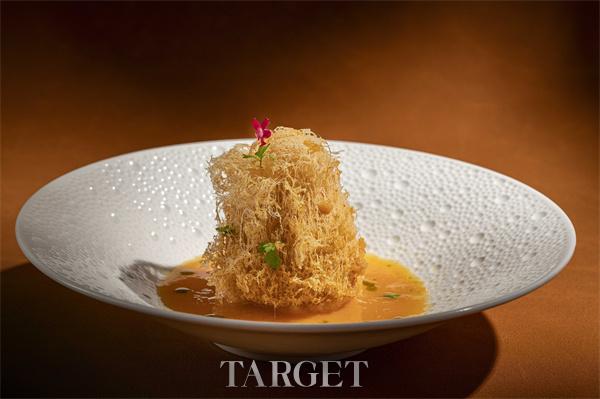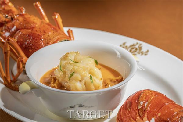 “鸡油菌芙蓉煮乳龙虾”选用云南时令鸡油菌,其色泽金黄、菌香浓郁,与鲜活小青龙共烹。以全龙虾熬制汤底,蒸制芙蓉蛋底,融汇龙虾的鲜甜、菌子的野香与蛋羹的滑嫩,成就一道色香味形俱佳的山海之味。