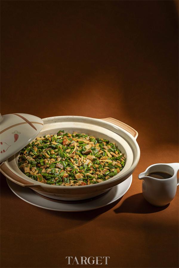 “山海荟萃丰收戈饭”灵感源自潮汕丰收时节的传统戈饭。融入虾干、肥美海瓜子、乌鱼子等海味,以及土猪五花肉与松茸菌等山珍。米饭饱吸精华,缀以韭菜增香,入口尽显山海交汇之丰美,寓意圆满,味蕾盛筵。