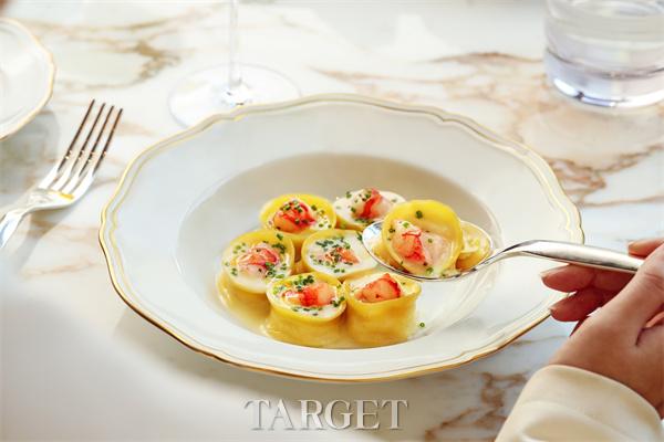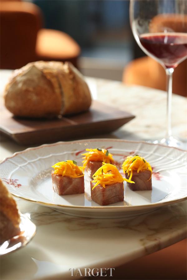 釉面黄鱼配土豆及欧芹,黄鱼外皮煎至釉色莹亮,内里肉质细嫩如蒜瓣。搭配绵密香滑的土豆泥与清新欧芹酱,口感层次分明,雅致中融合海洋的鲜润与陆地的清香。备受喜爱的意式手工饺子配红虾,黄油,柠檬及沙葱,传统意式饺子包裹细腻鲜甜红虾,馅料饱满而轻盈。以澄黄油汁轻裹,缀以现刨柠檬皮与清脆沙葱,入口丰润不腻,柠檬微酸巧妙提鲜,诠释秋日丰收的细腻与温暖;烤金枪鱼腩配南瓜及香橙,则选用优质金枪鱼腩,经精准火候烤制,外层微焦酥香,内里脂润柔嫩。搭配慢烤甘甜南瓜泥与清新香橙酱汁,南瓜的绵密与香橙的明亮果酸交织出饱满风味。