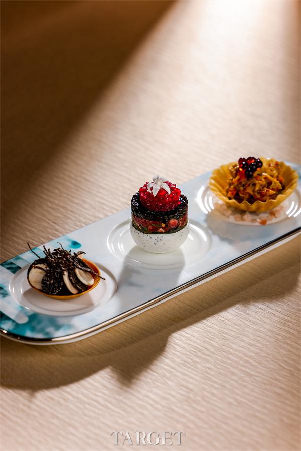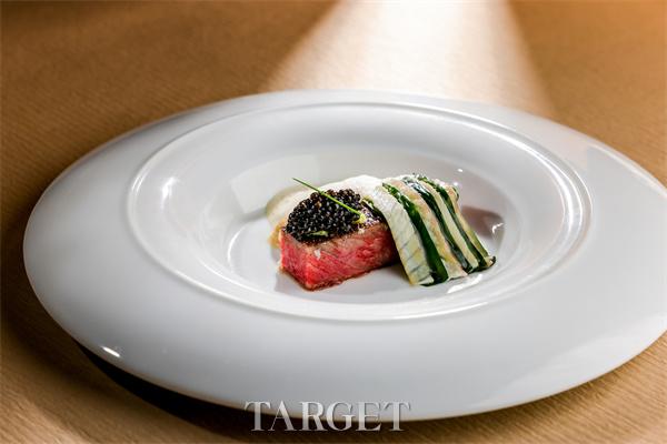 牛肉塔塔:咸味马卡龙置底,上层铺以芥末叶酱、紫苏及腌渍萝卜;再将M5牛肉精切成粒呈于其上,醇和脂香与清爽酸韵交织共衡。表层点缀的鱼子酱自然添味。