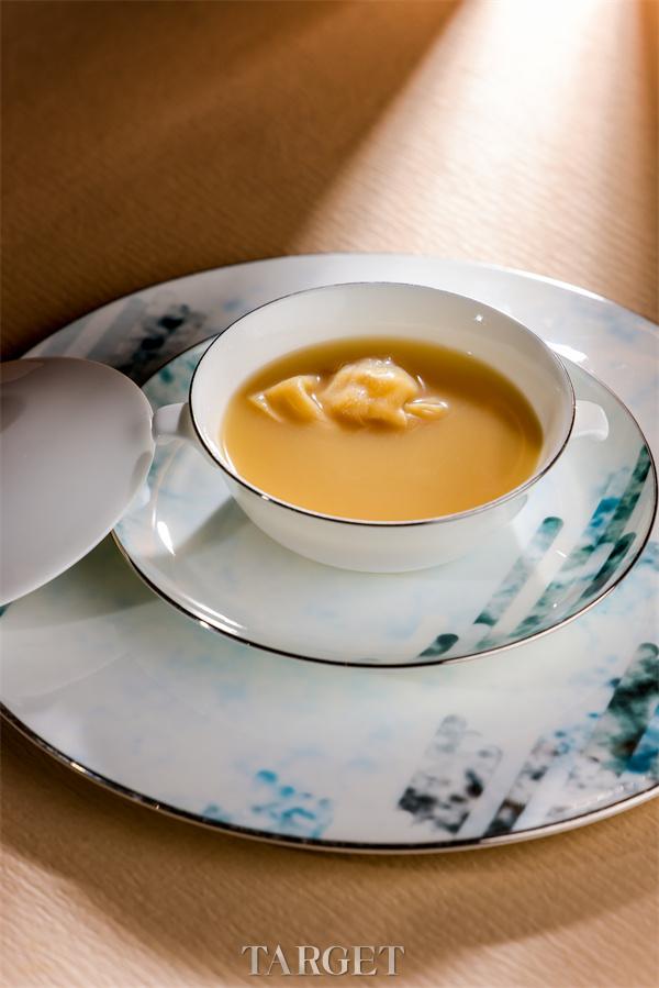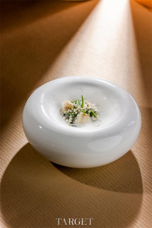 首先,将由高汤、昆布、泰国青柠等食材共融而成的生蚝海藻蛋羹置于盘底;随将新鲜生蚝精切呈块,与芹莴、苹果、以及经绿茶浸润后的若芽相制呈塔塔覆于其上,再伴以些许高汤木薯、生蚝叶以及酸奶昆布醋添抹清新之感。最后,将生蚝酱汁经液氮沥型呈珍珠袖球,漫撒些许于菜品表层,演绎出饱含自然滋味的臻意之作。