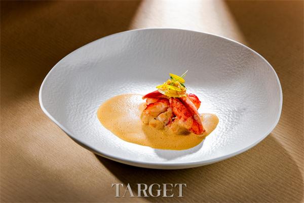 大西洋龙虾,作为泰安门的钟爱食材之一,此次以新加坡叻沙汤汁为灵感入馔,将东南亚风味自在演绎。先将龙虾肉置于盘底,随于其上覆以叻沙中解构后的经典食材:粉丝、豆腐、炸洋葱和鸡皮,这些配予均被精切成小块并呈以香脆形式;并轻裹于制成面条状的球茎甘蓝片之中,令人赏心悦目,更在口感上带来了别样的体验。