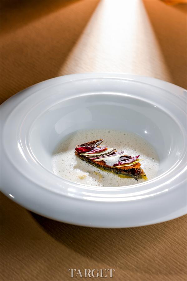秉持探索在地食材的初心,精选有机玉兰菜,匠心呈现这道蕴藏自然之馈的时令飨味。先在盘底轻铺晶莹蘑菇酱层,轻柔唤醒味蕾;作为主角的玉兰菜则置于藏红花酱汁中慢火细炖,直至精髓尽释呈柔软质地,随覆以香脆味增酸面包片于其上,交叠出多层次雅趣口感。
