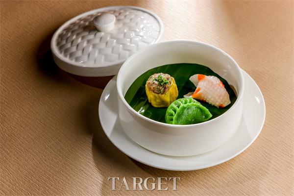 点心伴三虾炒饭、金鱼蟹肉饺、干蒸牛肉、翡翠菜苗饺(御苑中餐厅)