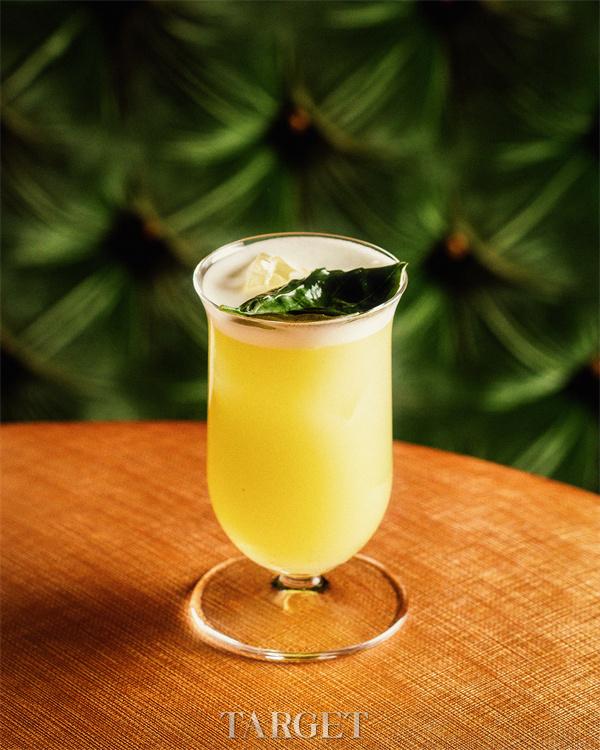 Basil Smash(罗勒派对)—— 这杯生机盎然的绿色“Daisy”鸡尾酒,灵感来自Mark钟爱的米兰Moebius酒吧,以帕玛森杜松子酒与青酱的咸香交织,带来耳目一新的清新口感。