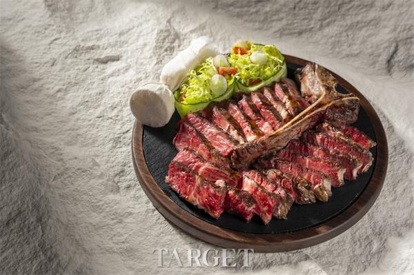 招牌是佛罗伦萨传奇炭烤T骨牛排,仅用意大利海盐、橄榄油与黑胡椒极简调味。餐厅选用澳洲M7和牛,以极高温炙烤,形成焦香浓郁的外壳,牢牢锁住肉汁,最后以迷迭香烟熏点睛。“我们始终以食材本身品质为核心,”主厨解释,“技法只为放大食材本来的风味。酱汁可作点缀,但调味力求简单,让食客真正尝到牛排本身的味道。”